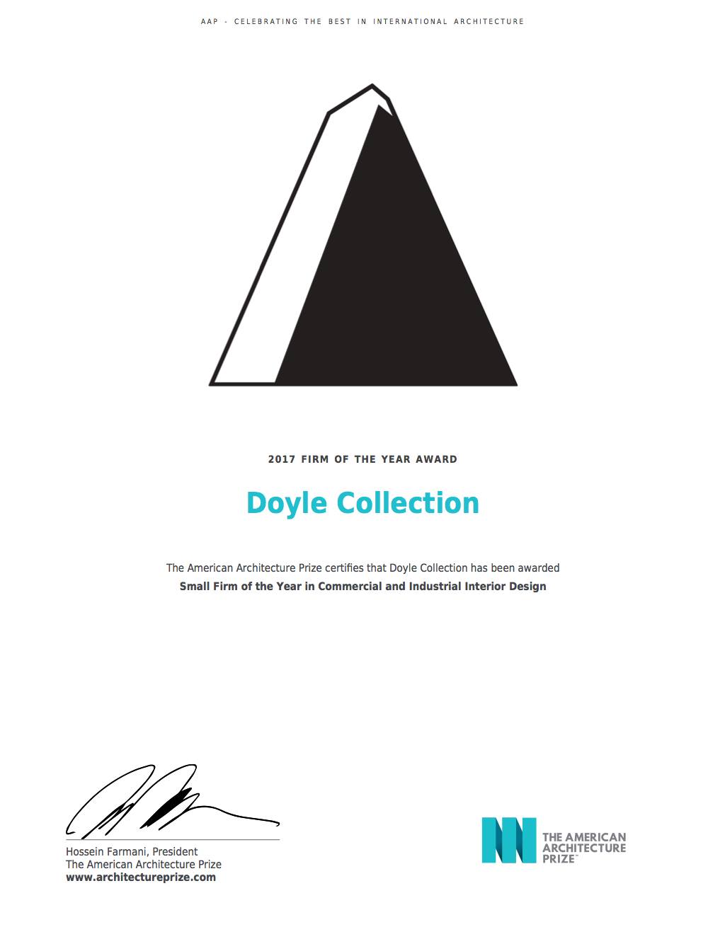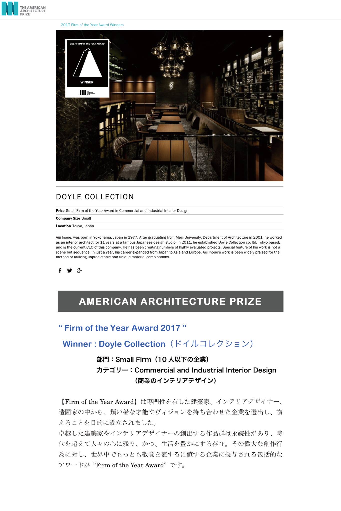 弊社がニューヨークにて、5年以上の社歴のある世界中の企業を対象とした「会社を評価する賞」である「Firm of the Year 2017」にて、【世界一】として表彰されました。(社員10人以下の部門、商業インテリアデザイン事務所のカテゴリー)