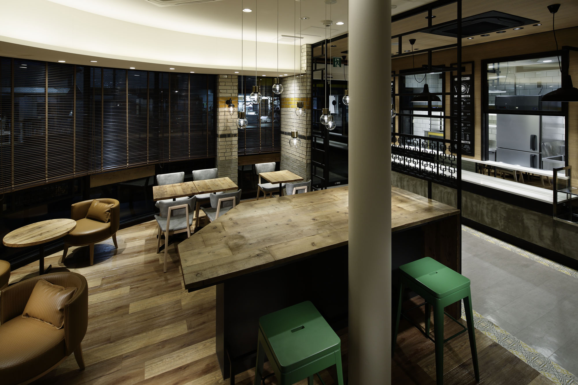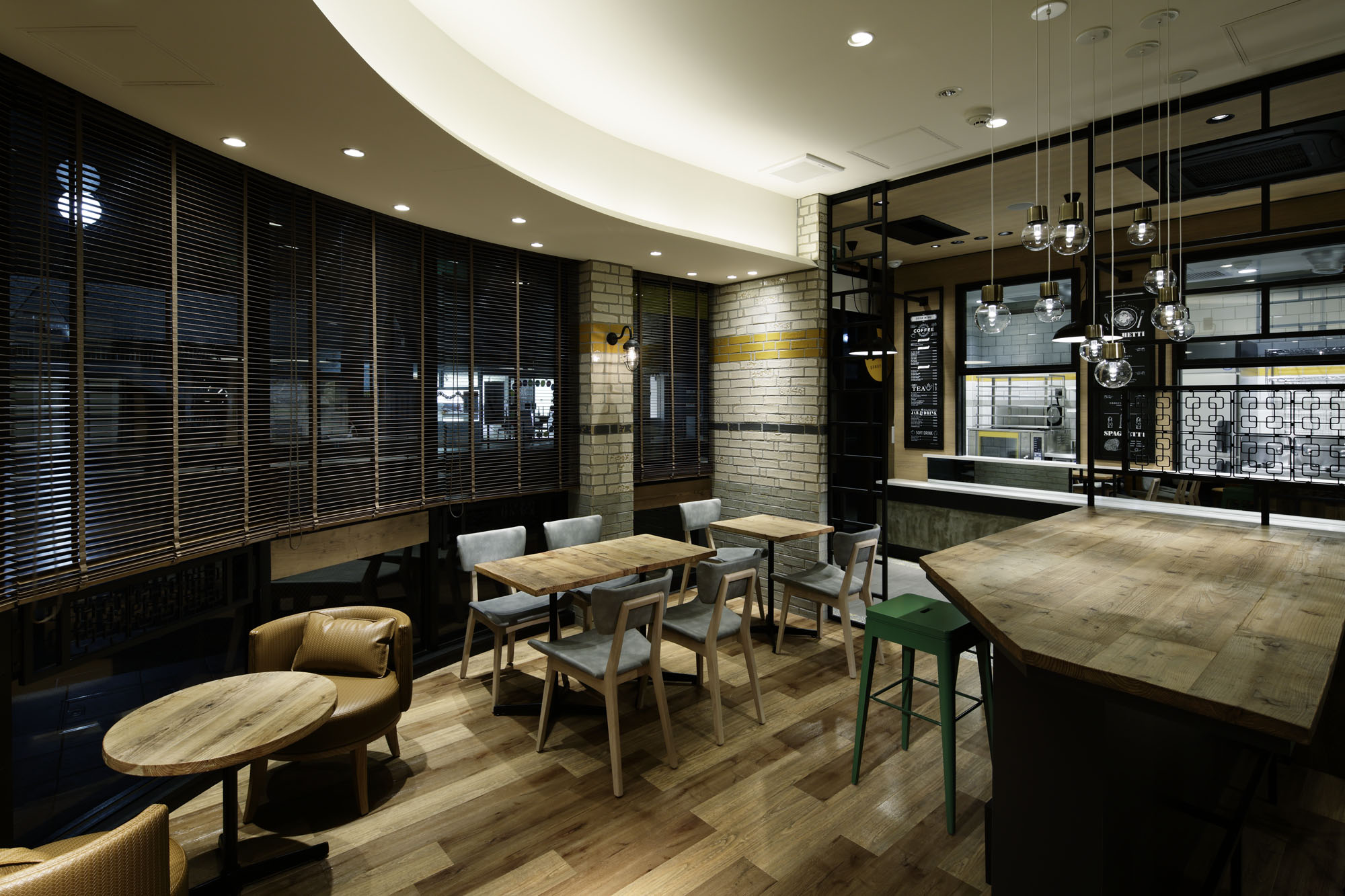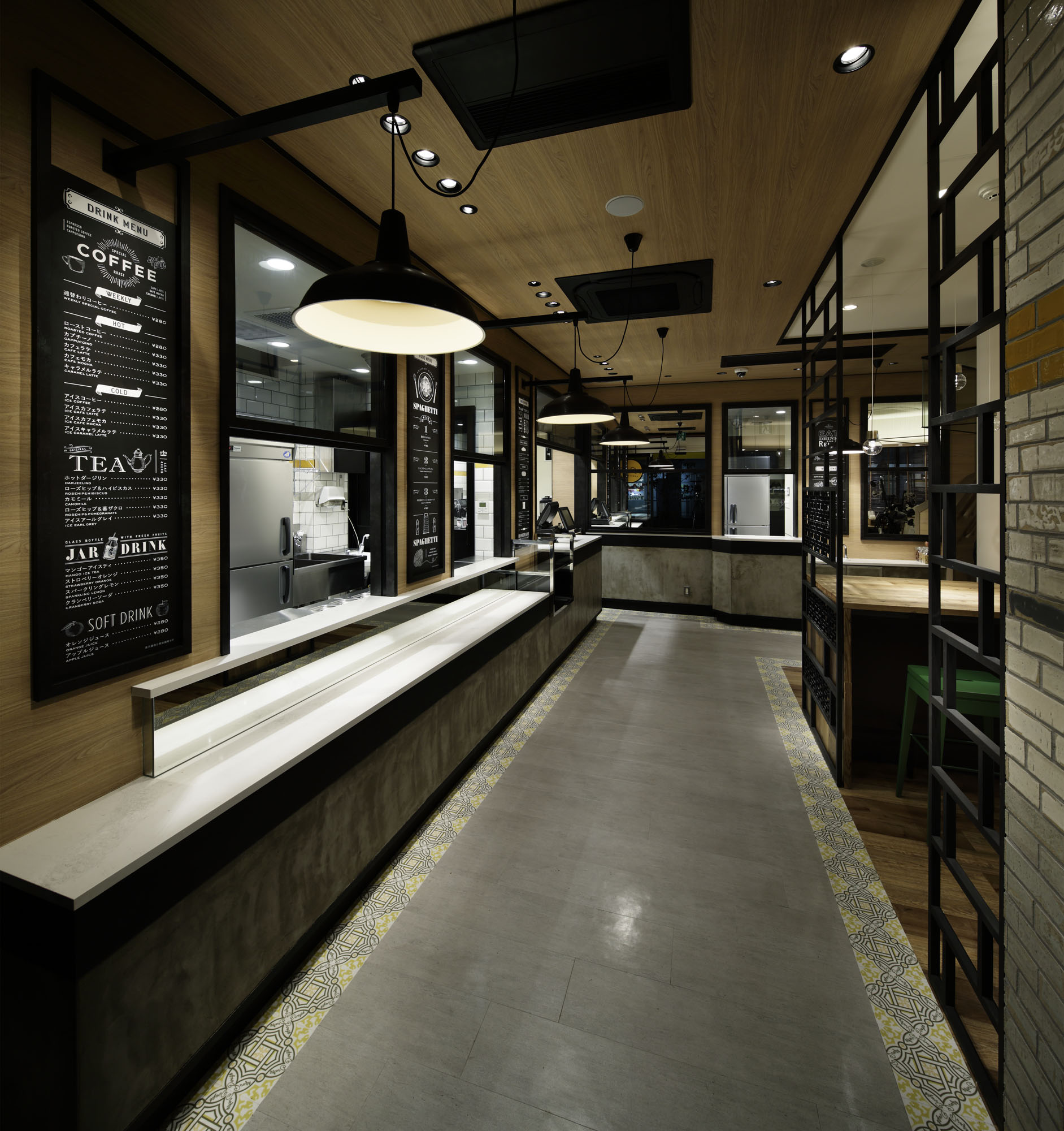 Taking advantage of our client’s strength, one of the first characteristic points of this café is the relation between the purchase counter and the kitchen. It is not only an open kitchen without partitions. By setting up a wall and balanced-sash-window, it enables to control the distance of customers and staff members according to cooking contents and the time of day. This counter style will make the customers’ flow even smoother. They can use the tray, take the products, go to the cash register, pick up the condiments, and go to their seats.