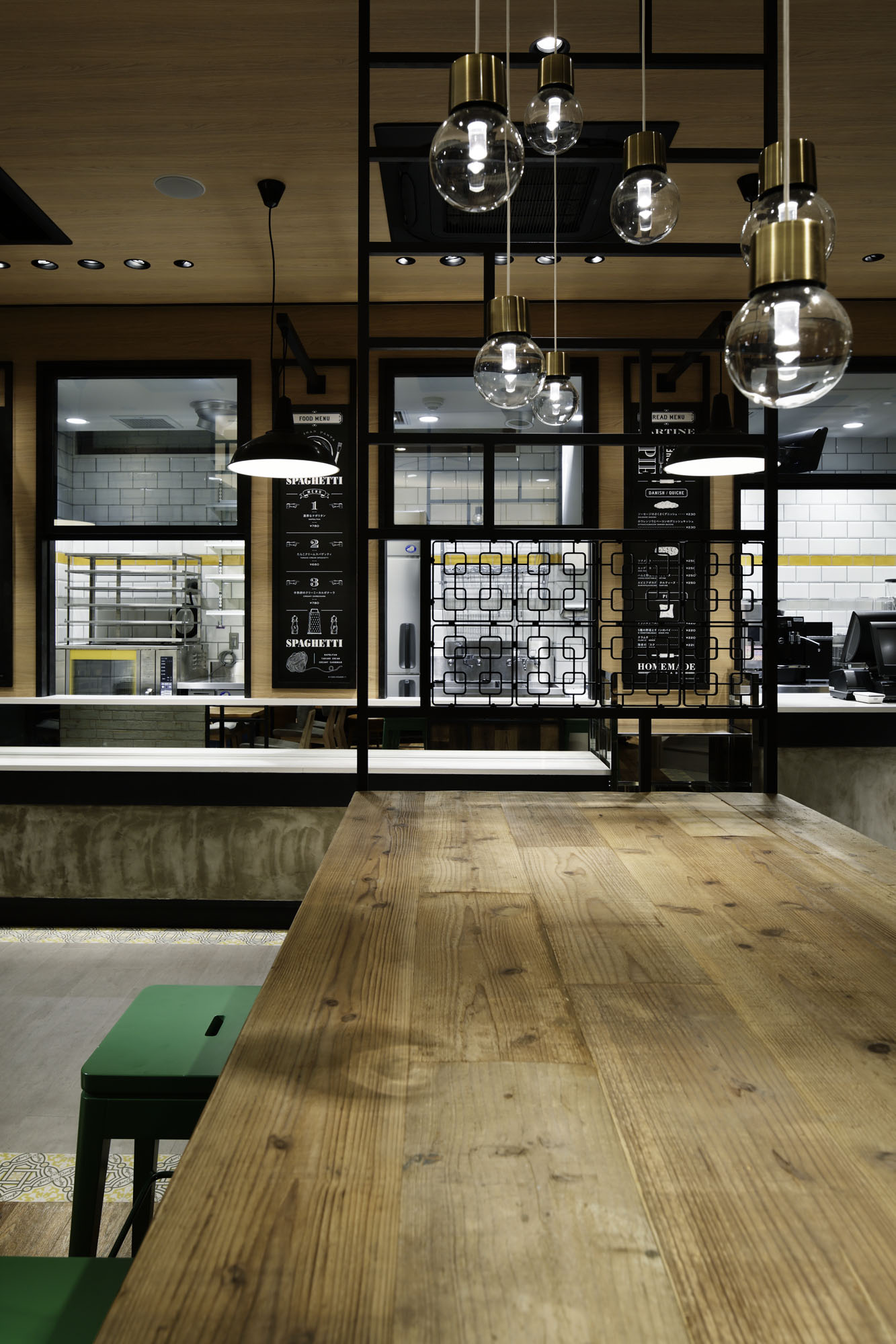 このカフェで「ユニーク」と感じてもらえる最初のタッチポイントはカウンター型の商品提供スタイルです。ただ単に解放されたオープンキッチンとは異なり、間仕切り壁に上げ下げ窓を設えることで、お客様との距離を自ら近づけようという当ブランドの意思をデザインに取り入れています。お客様がトレーを持ち、商品、レジカウンター、コンディメンツを経て客席へという流れをスムーズにすることも、このカウンタースタイルが可能にしています。