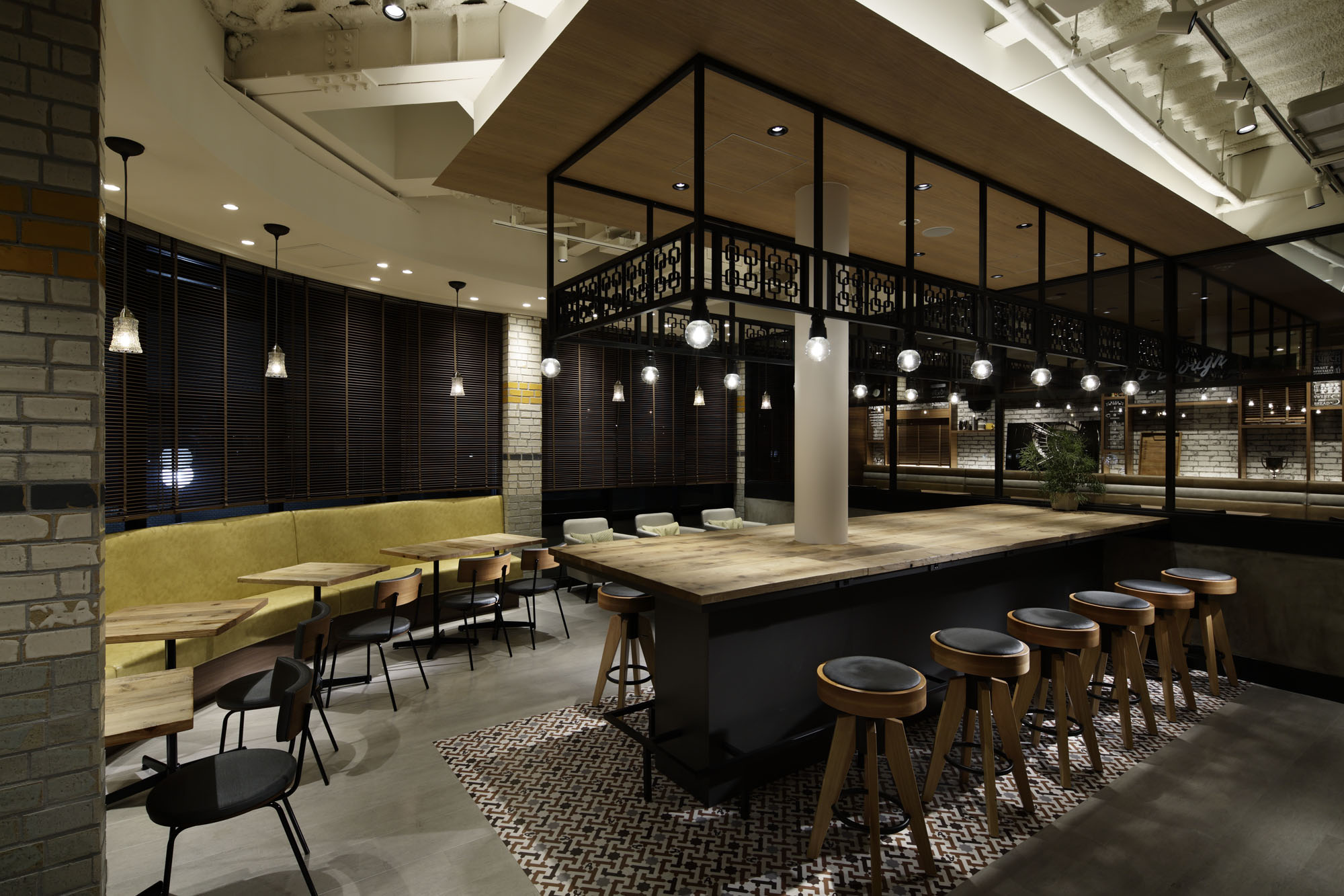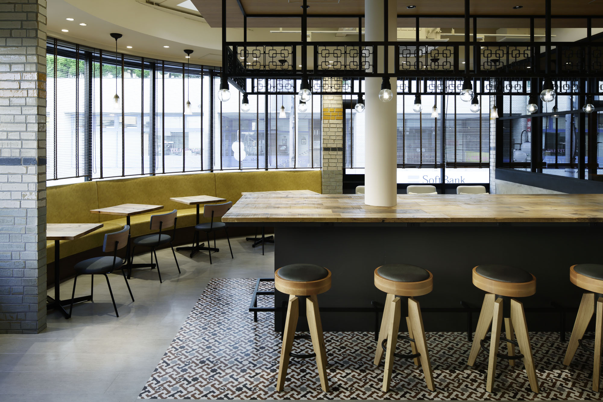 客席での「ユニーク」な試みは、微妙な不揃い感です。席を足したり引いたり、ソファを入れてみたり、カウンターの椅子を変更したり、あたかも「カフェのオーナーが数年かけて、隣席との距離感や関係性を調整した」かのような表現を目指しました。ただし、アンティーク家具や一点モノを使う手法はチェーン展開を狙う当ブランドとしては選択肢になく、「一度整えたデザインを肌馴染みよくカスタマイズする」程度で止めるのも不可欠で、その均衡を保つことがポイントでした。