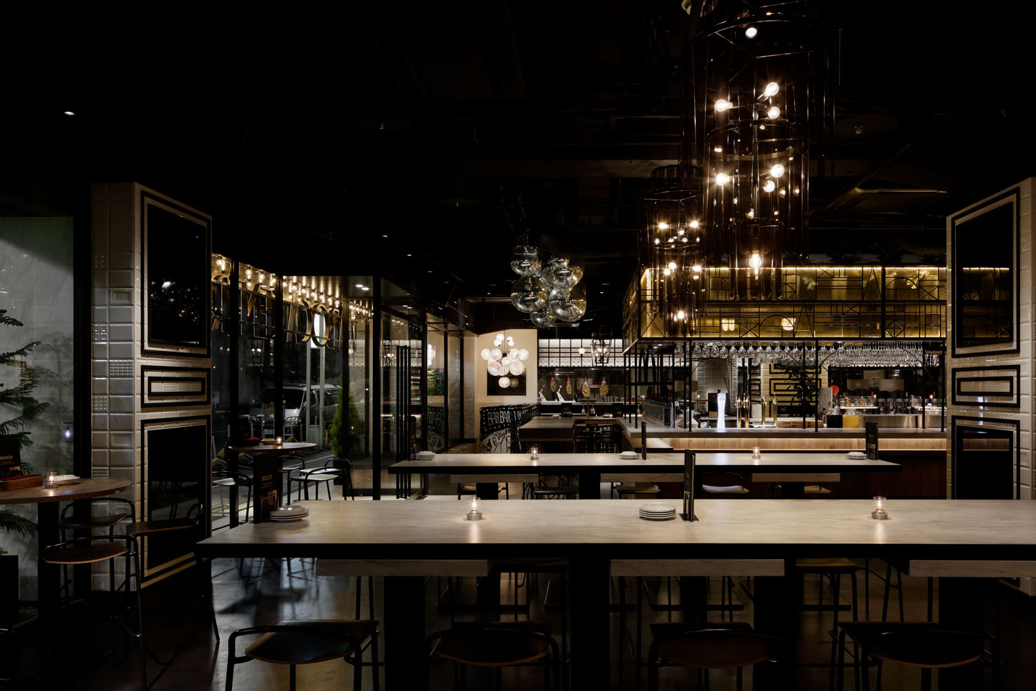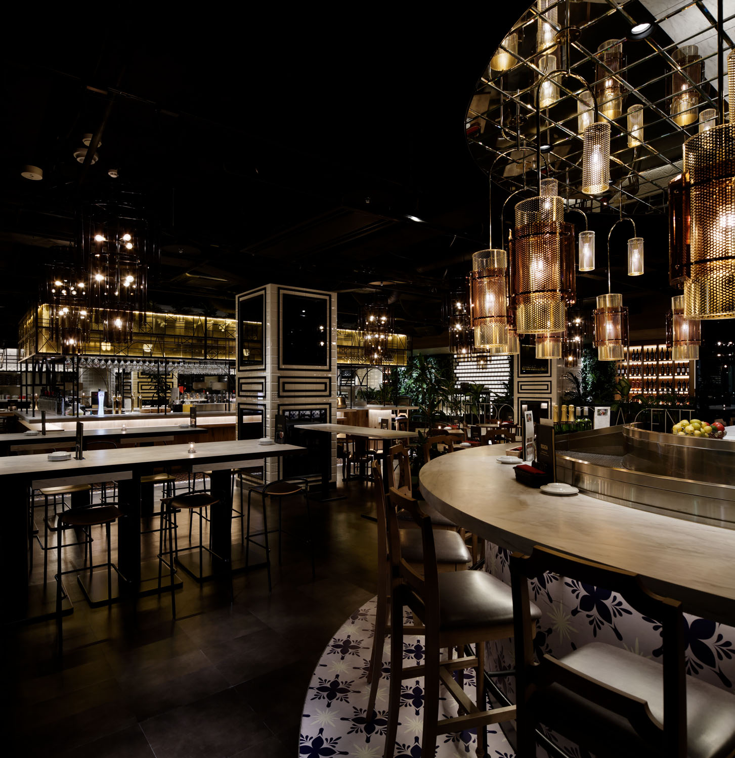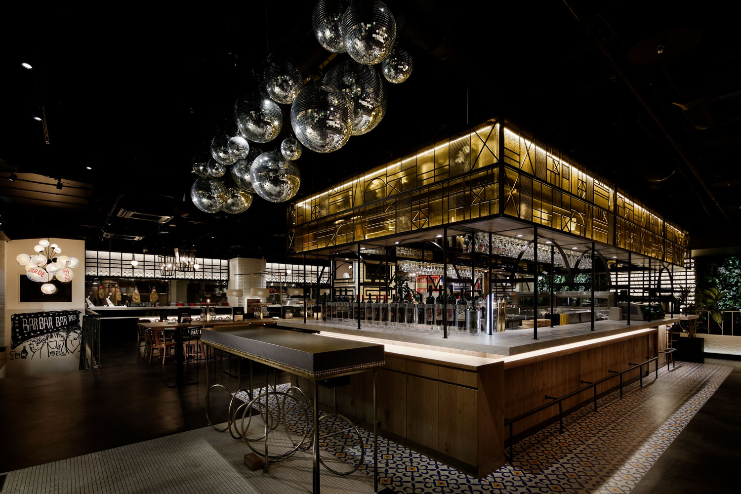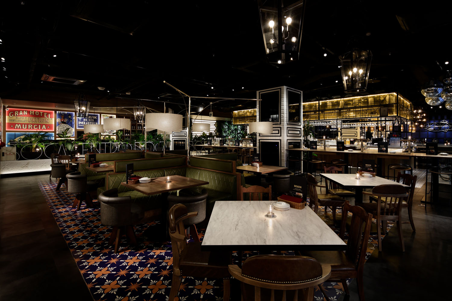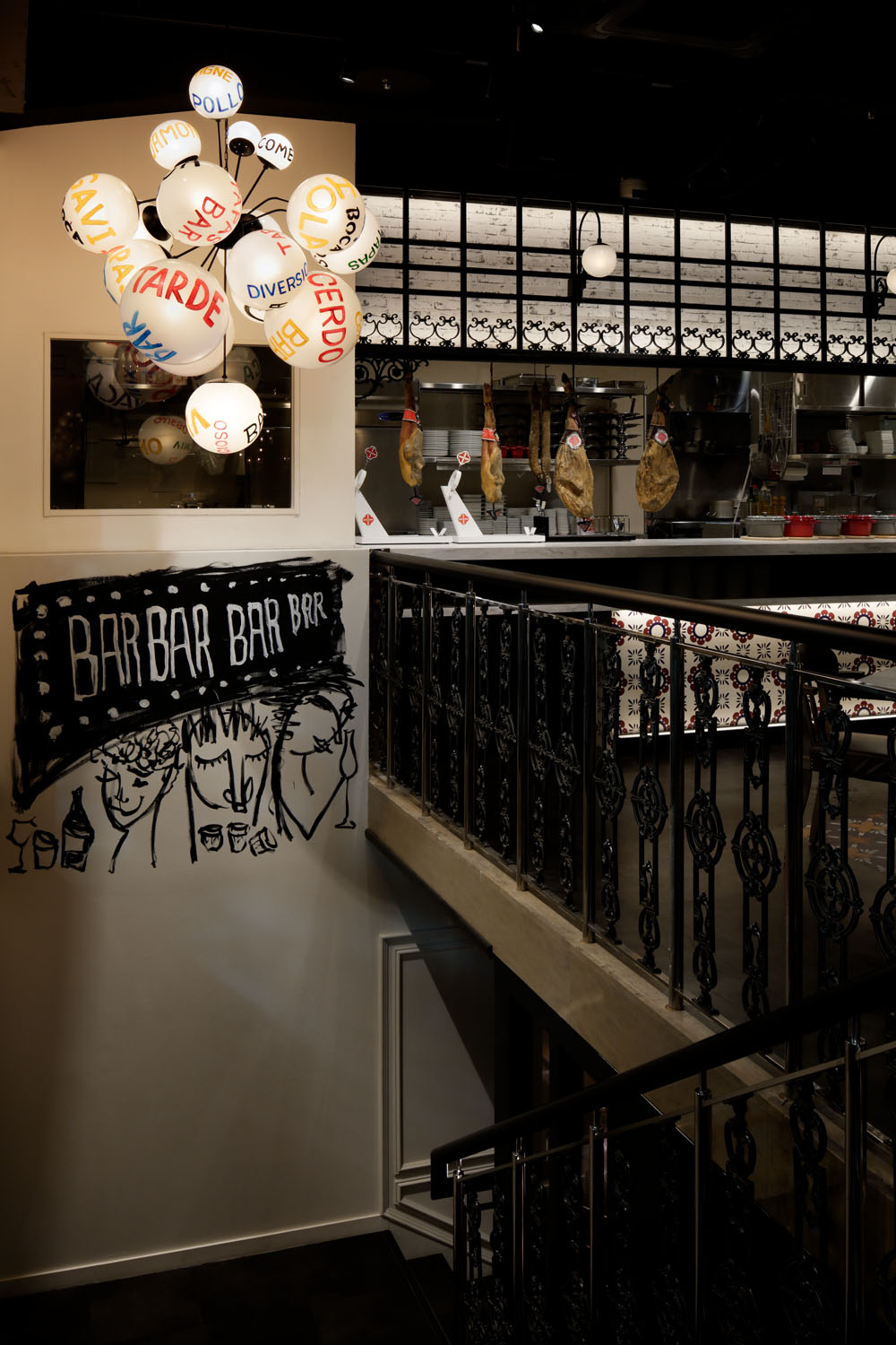 Partitions and walls are not for dividing space. We visualized each area’s characters by adopting not only colour contrast that can be seen apparently, but also patterns of tiles, designs of pendant luminaries and table heights. In addition, we placed kitchens and Bar counters separately to make them as icon for each area to create context sceneries of Spanish cities and off-streets.