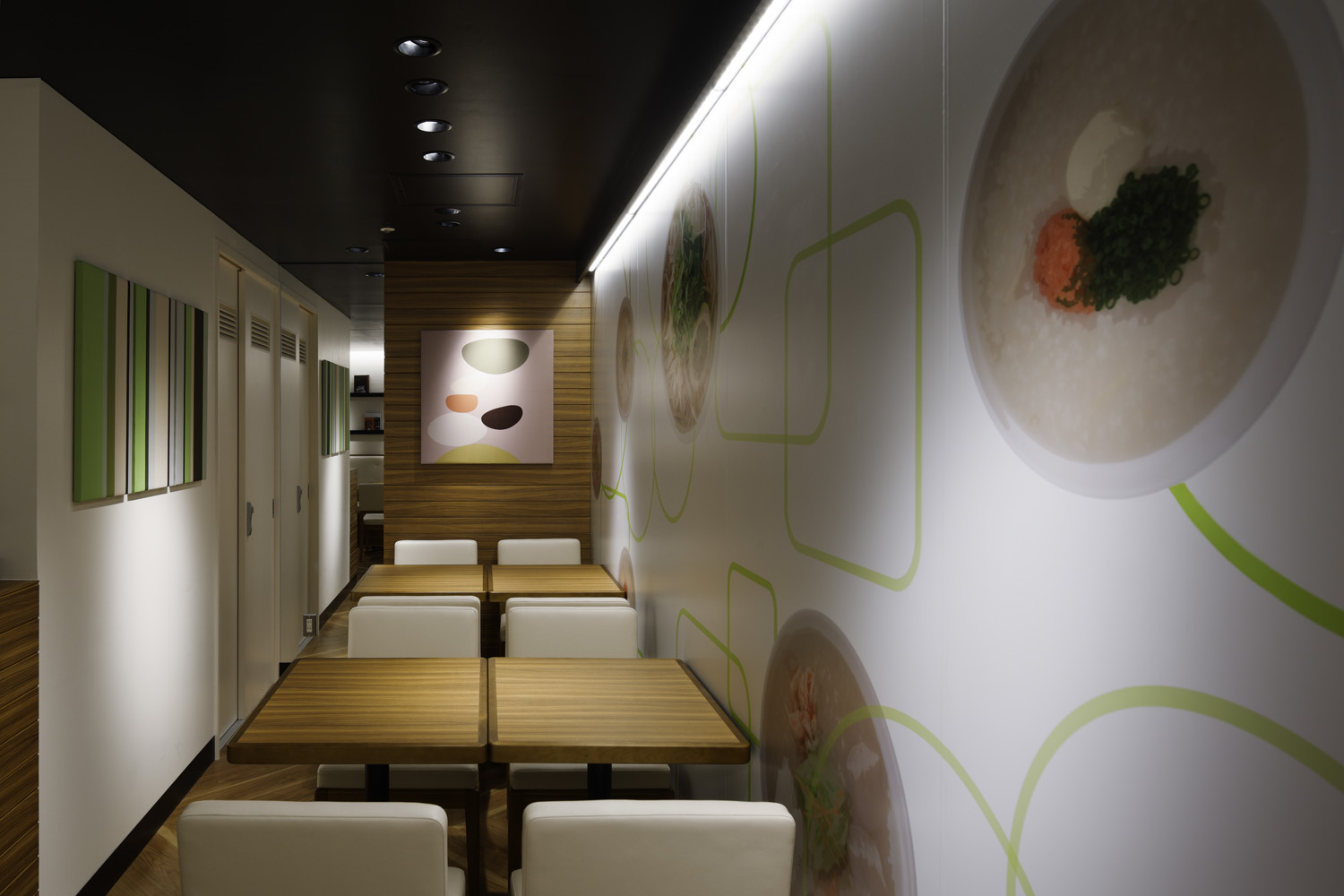 Furthermore, in the open kitchen and counter seats, glass-tile-walls give clean impression and individualize the shop. We displayed five grain rice known as health food at the top of the opening. This space will visually express the concept of the shop.