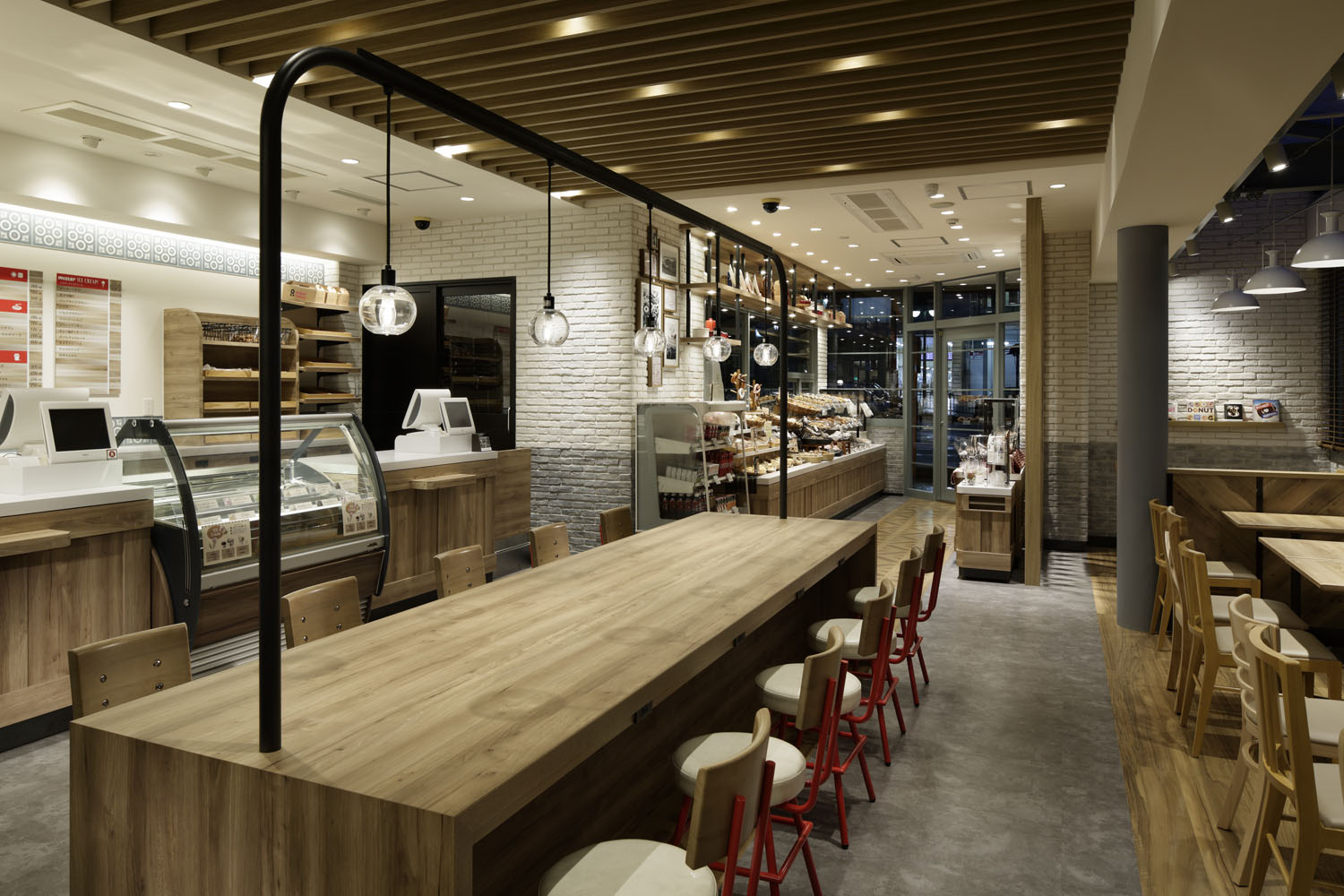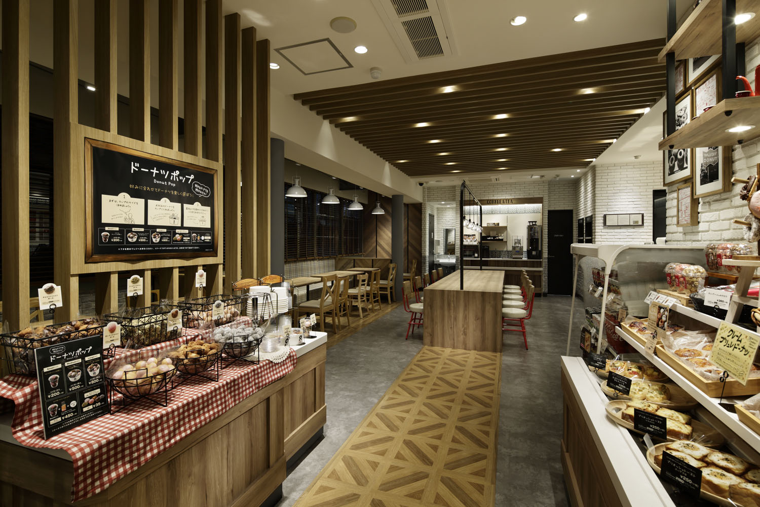 その膨大な再編業務の中で何点か触れるとすれば、一つはキッチンとショーケースの関係性を可視化したこと。「バラエティ豊かなドーナツの彩り」が映え、かつ、「手づくり・できたて」をダイレクトに表現するため、実際にキッチンから直接ショーケースに商品を並べられる部分を造り、陳列方法もベーカリーを想起させるようなスタイルを採用した。制作工程が見えるオープンキッチンはとても楽しく興味をそそり、ベーカリースタイルはできたてを表現する方法が自由度を増している。