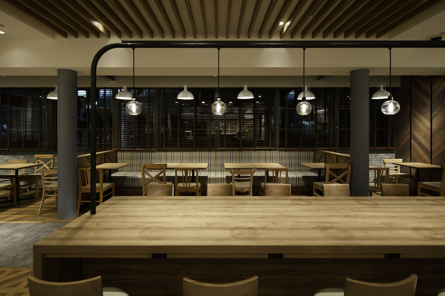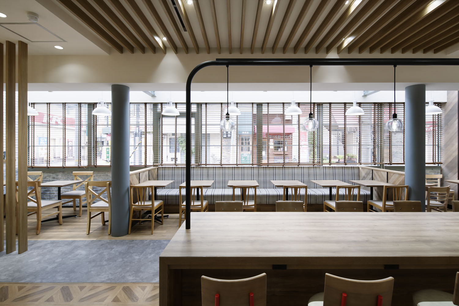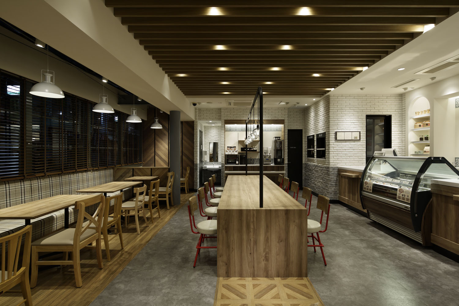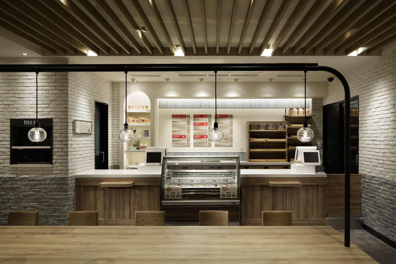 もう一つは客席のバリエーションをより強化したこと。もともとは「どの席も等価」と感じるものだったところを、ビッグテーブルやペンダントライト、ディスプレイ棚等を利用し、エリア毎に特徴を付加することで、シーンや気分によって「選べる客席」を目指した。