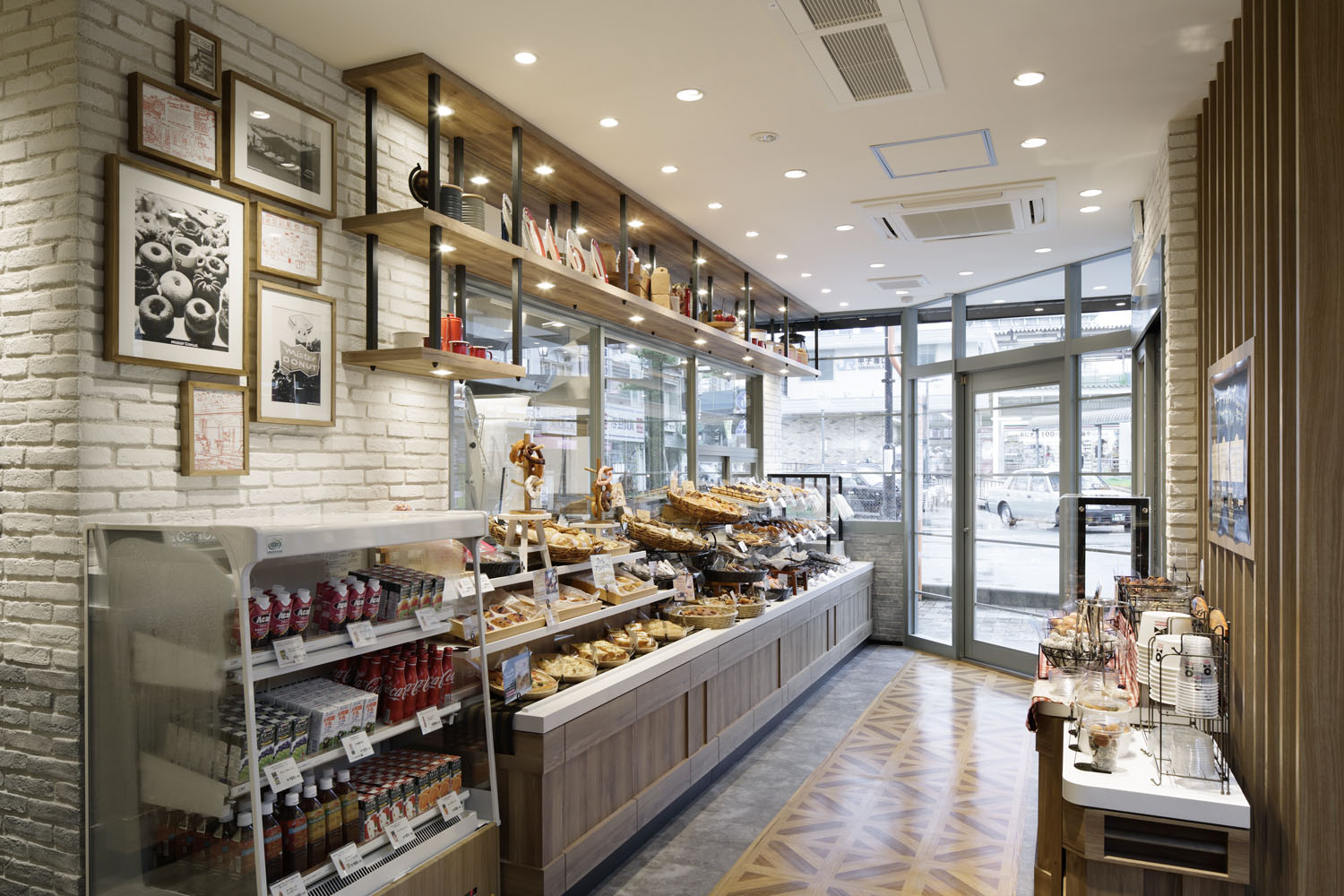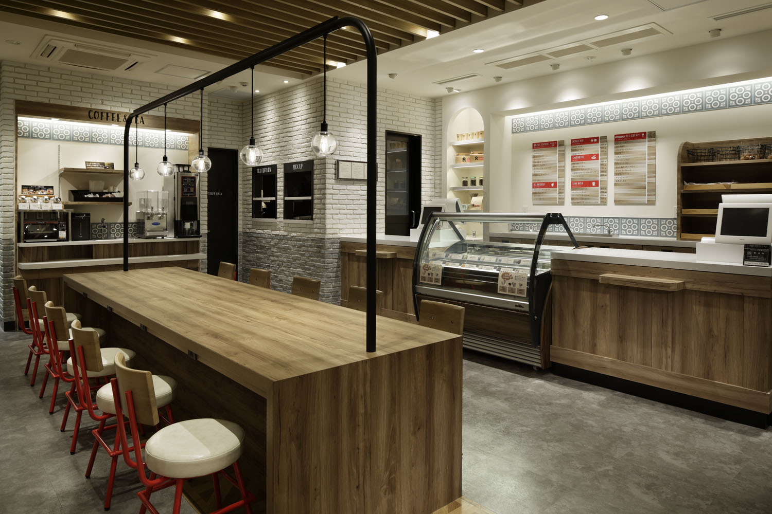 Firstly, we visualized the relationship between the kitchen and the showcase. We directly expressed the donuts’ “abundant color variations” and “handmade, fresh from the oven” image. We therefore set up a showcase connecting to the kitchen so that donuts could be displayed directly from the kitchen. We also adopted a style that evokes bakery displays. Through this open kitchen, you can see the production process, which is enjoyable and pleasant. This bakery style will allow greater flexibility to express the fresh from the oven atmosphere.