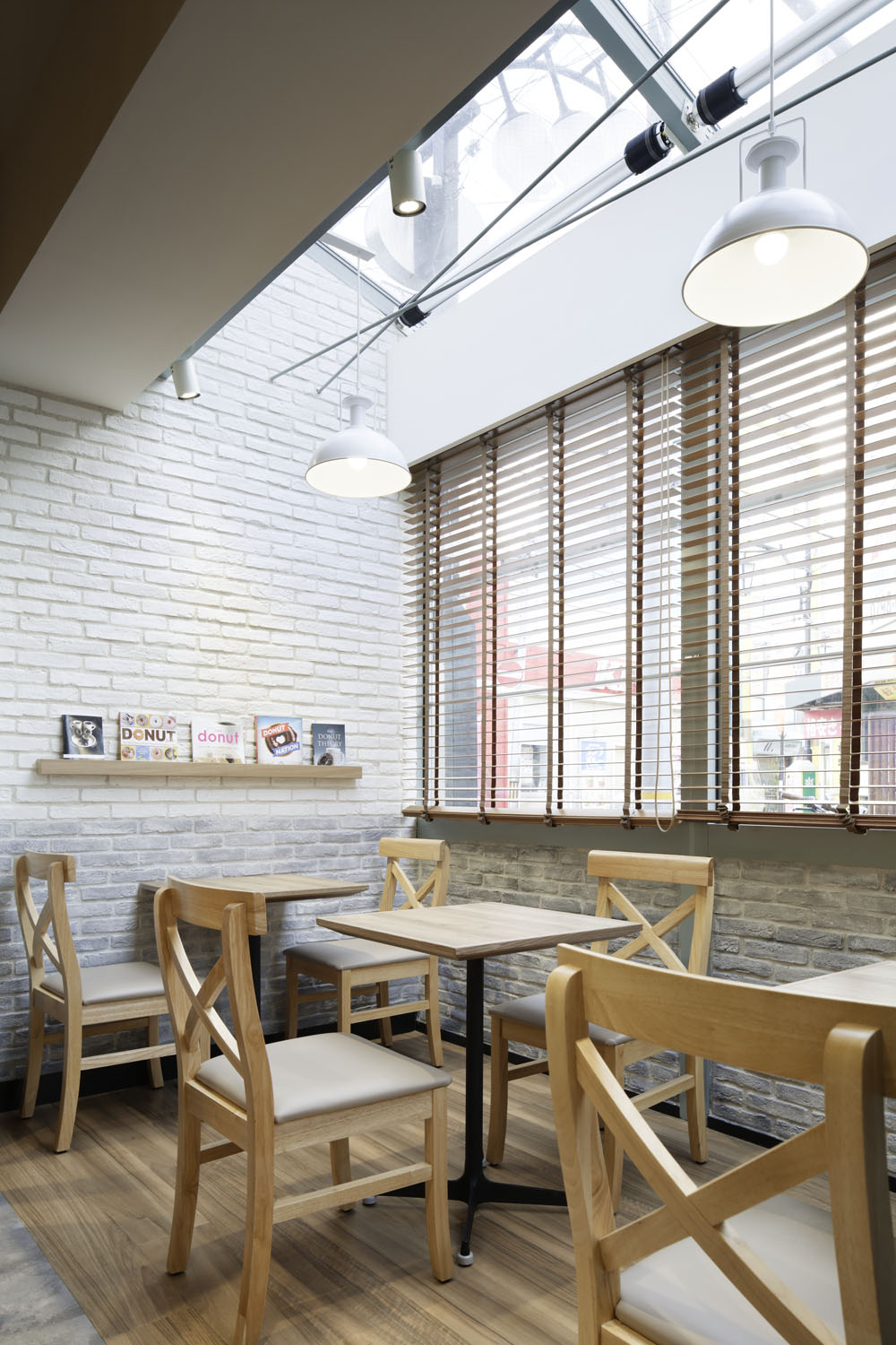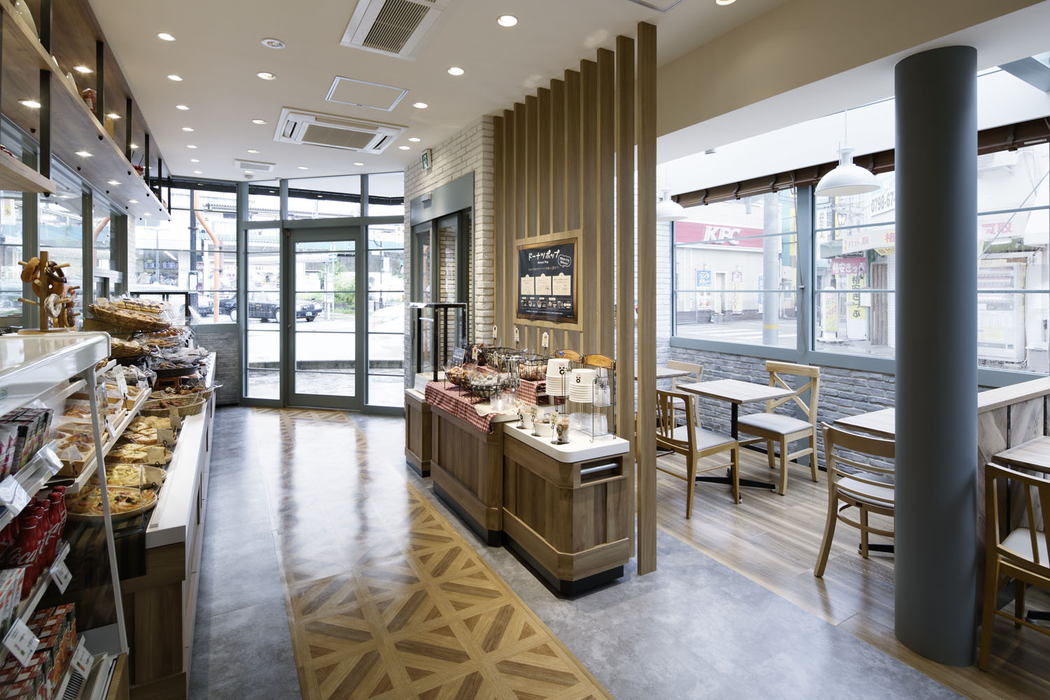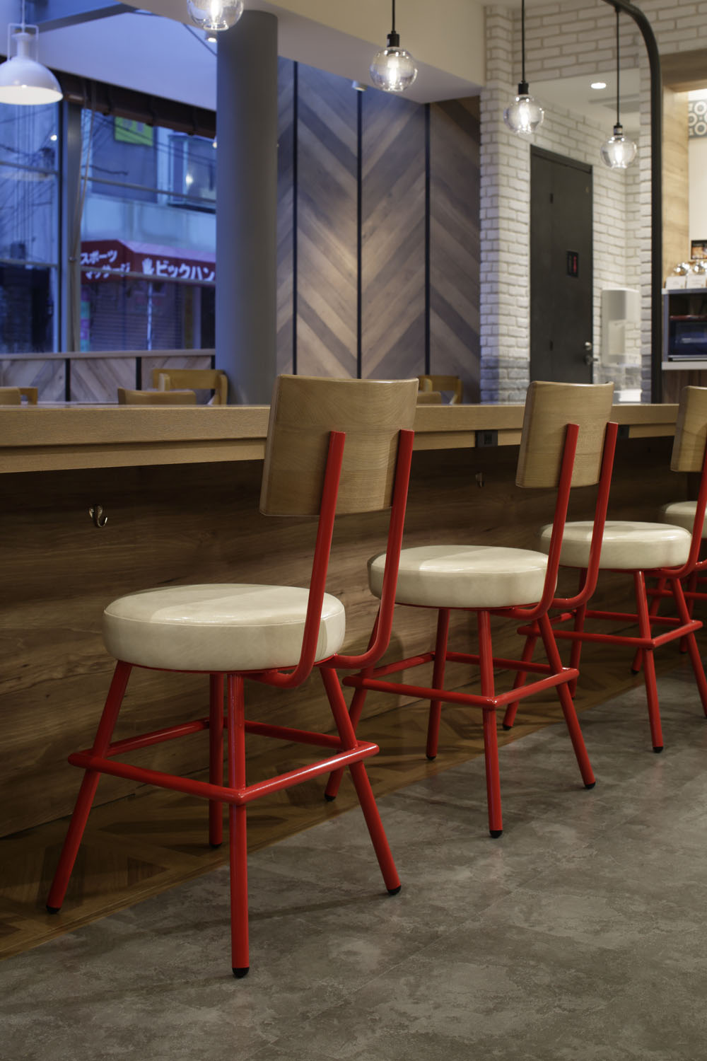 We assorted “ live materials” for finishing to make the materials look better and to appreciate them as time progresses. These material groups have remarkable attention in the world. Nevertheless we gave full consideration to its usage. In foreign countries, aging degradation is considered a positive effect. However in Japan, “Security, Safety and Cleanliness” are the original awareness. Thus, the way people in Japan feel toward aging differ from other countries. Utilizing this aging in a form of “aligning with contemporaneousness under the right conditions”, they would look even more modern-styled. Customers from any region could comfortably spend their relaxing time in this brand-new designed Mister Donut.