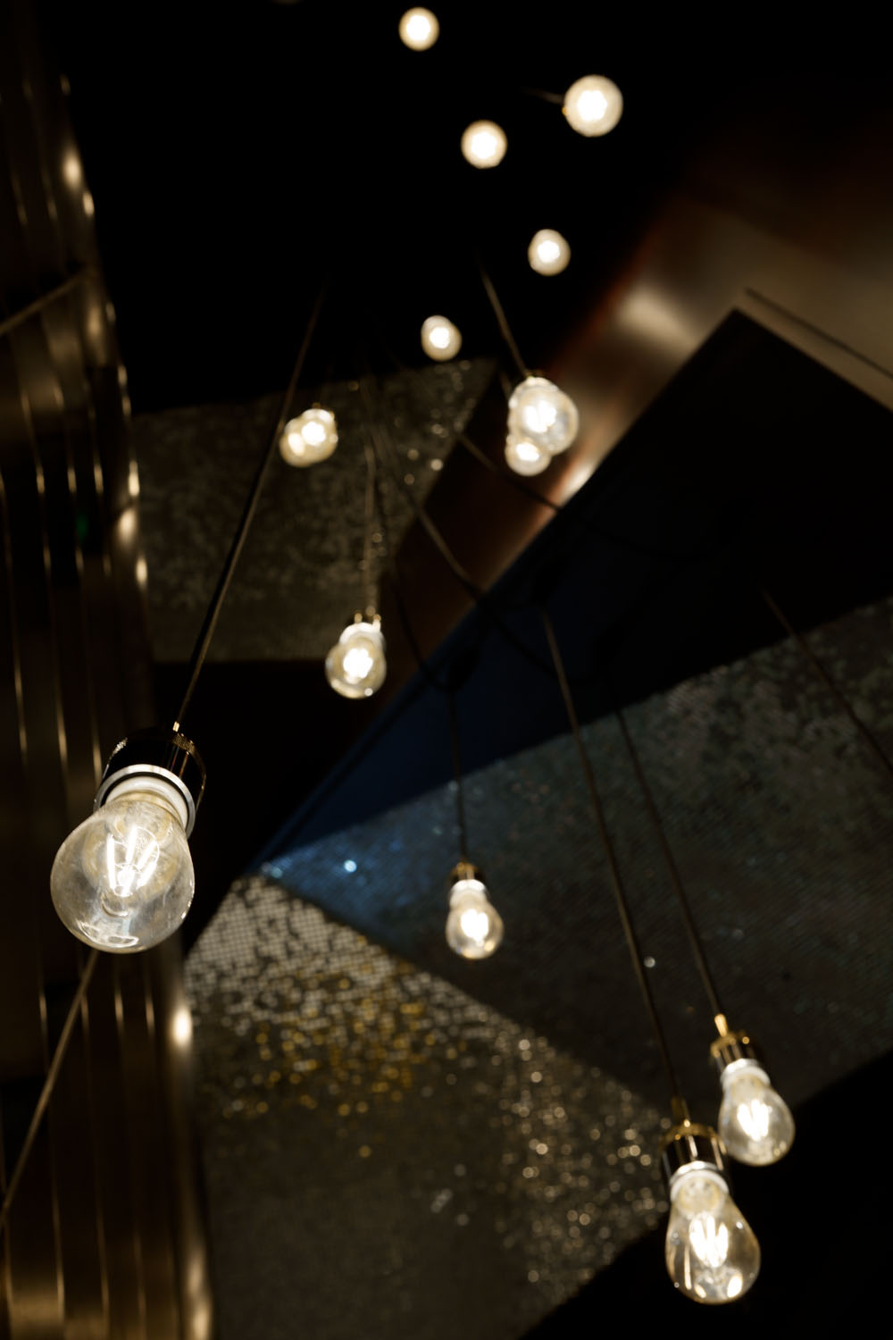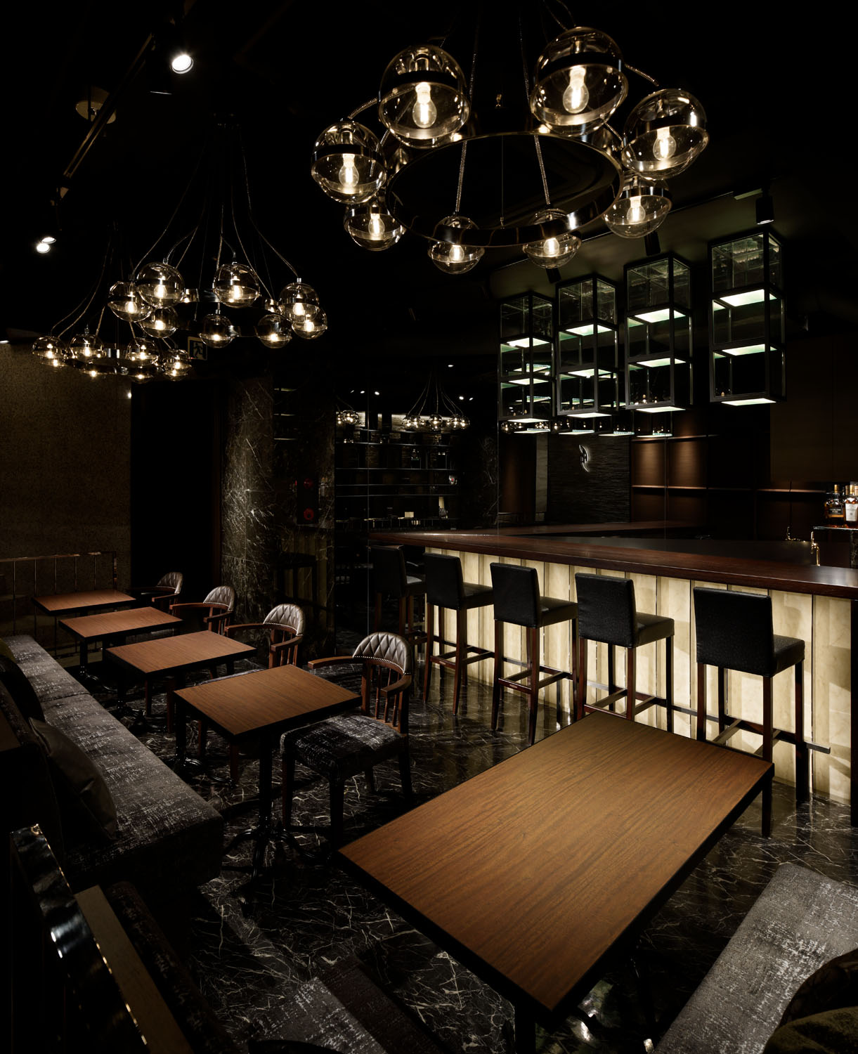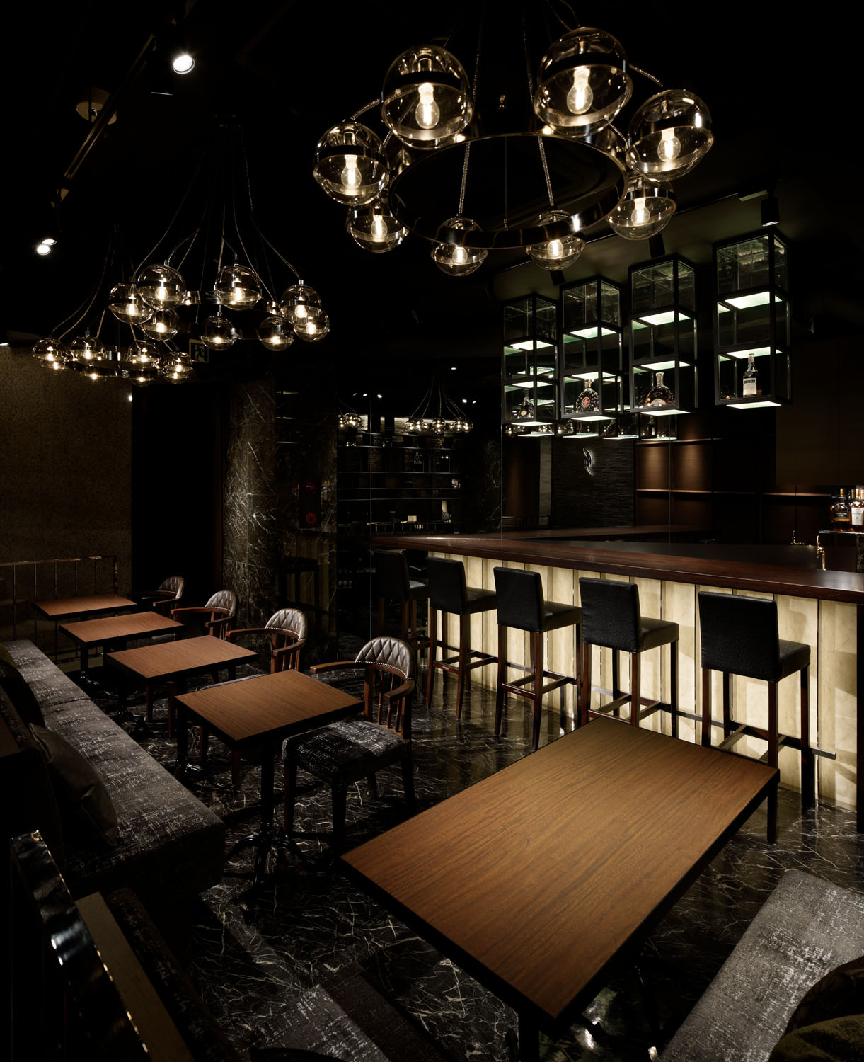 浮遊するように見えるシャンデリアやBarカウンター上の棚板が、非日常感を増幅させるとともに、そのミュージシャンが音を奏でる寸前の「静寂と期待が絡み合う緊張感に似た空気感」が漂うBarを創出できたと思う。もしそのミュージシャンのことを深く知らなくとも、この空間にはきっと同じ世界観を好むお客様が集まることだろう。