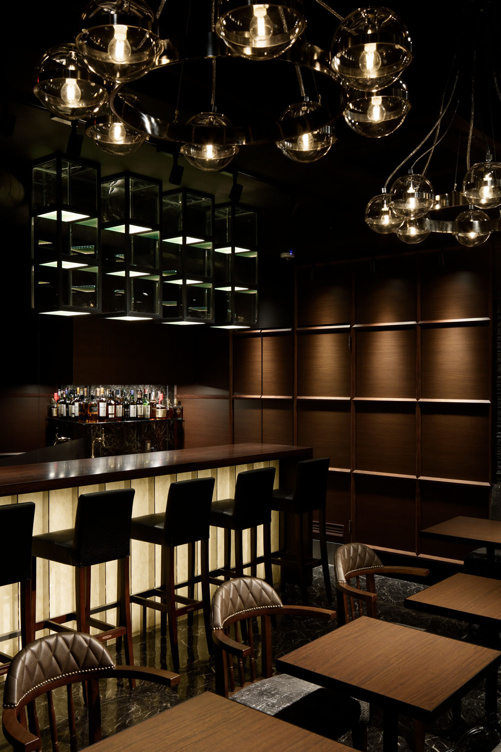 Chandeliers that seem to float in air and shelf boards for Bar counter will increase extraordinary atmosphere. We were able to create with similar tense feeling of silence and anticipation intertwining, just before this musician is about to hit the notes. Even if he is little known, bar clients will gather here and appreciate his enticing view of the world.