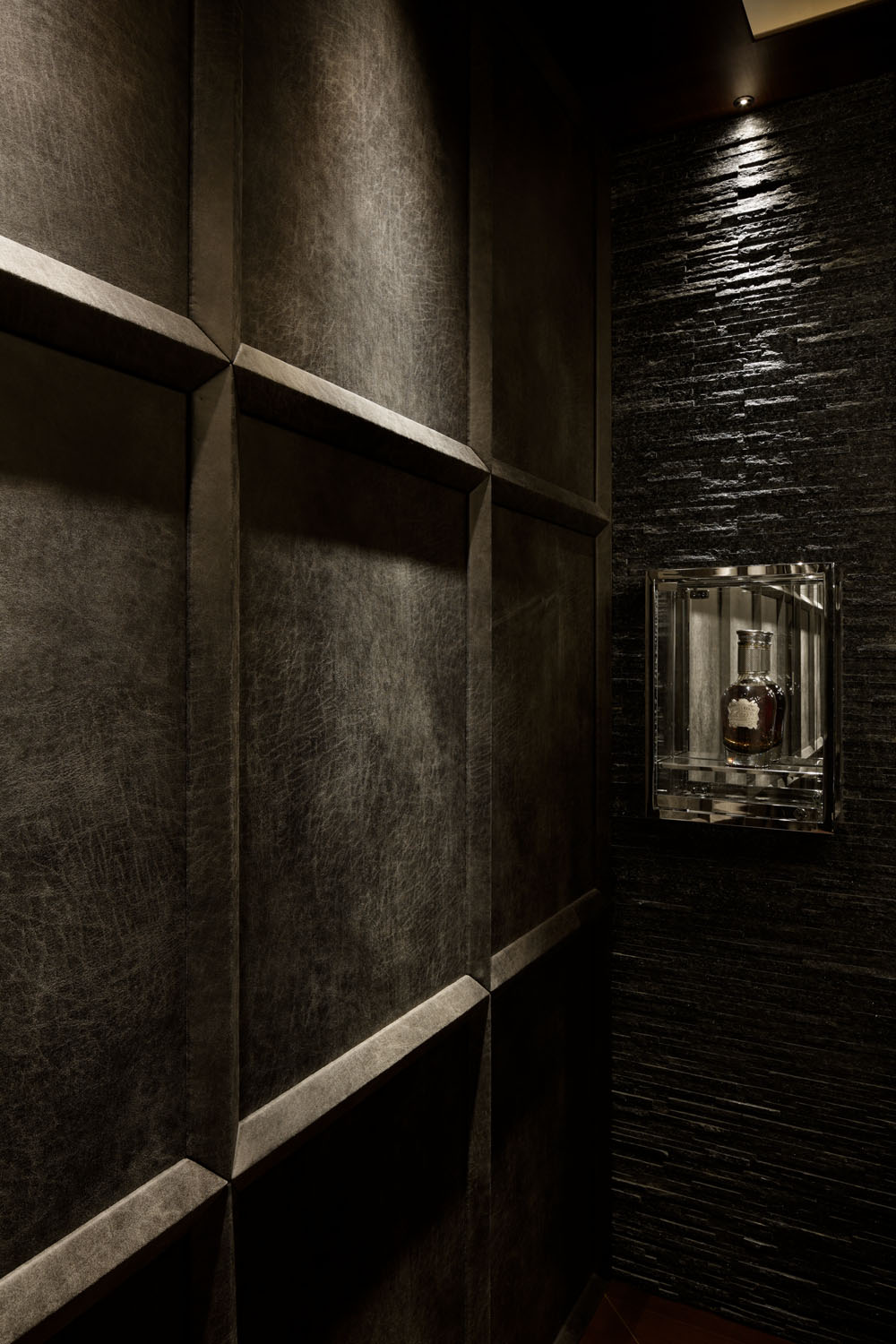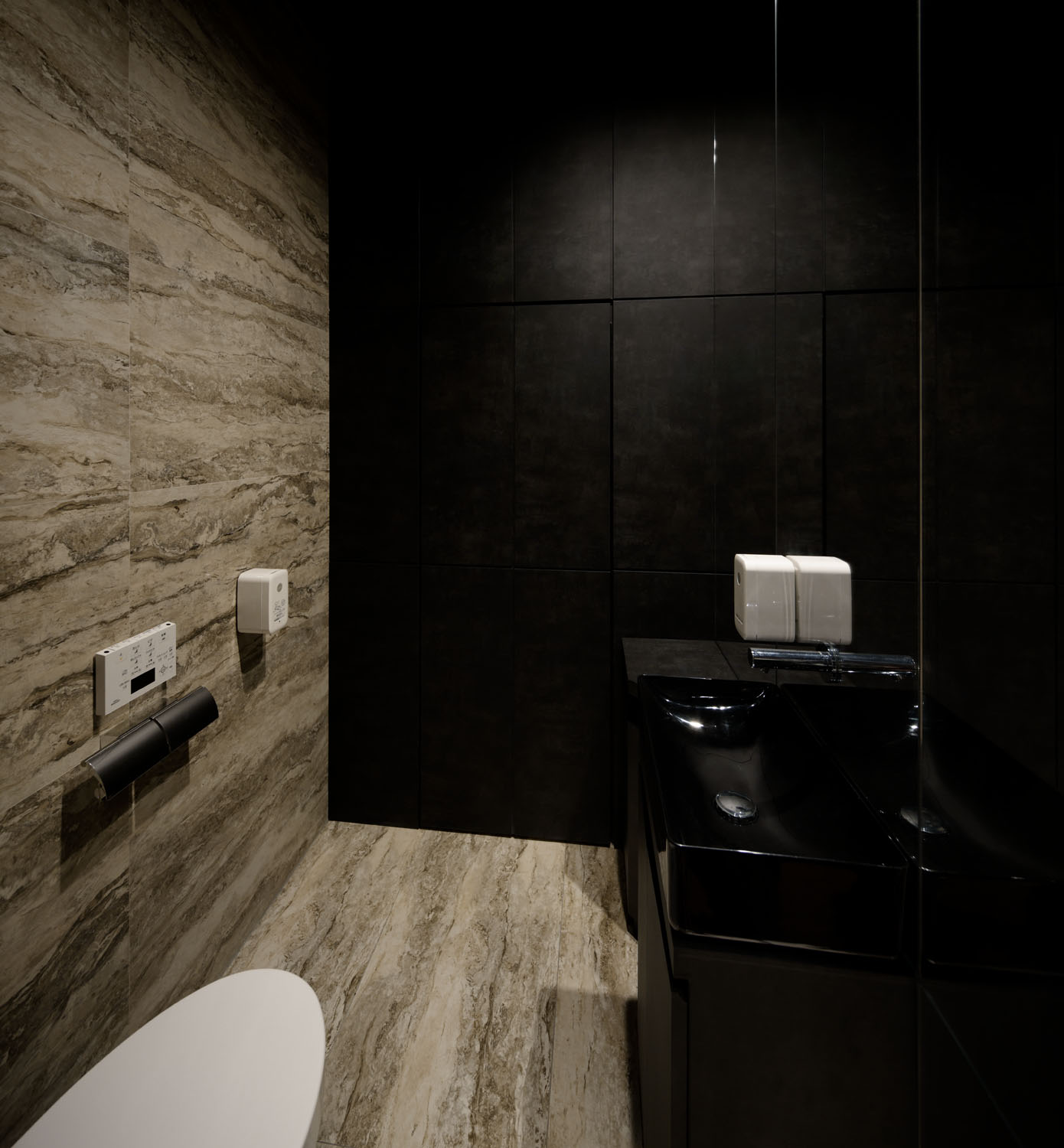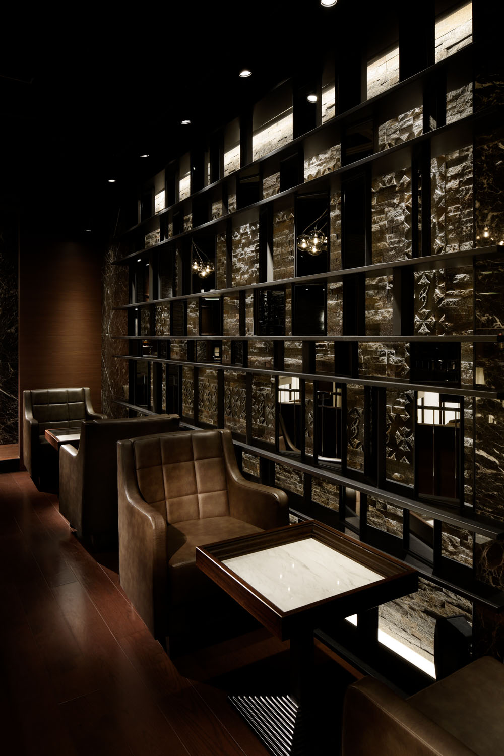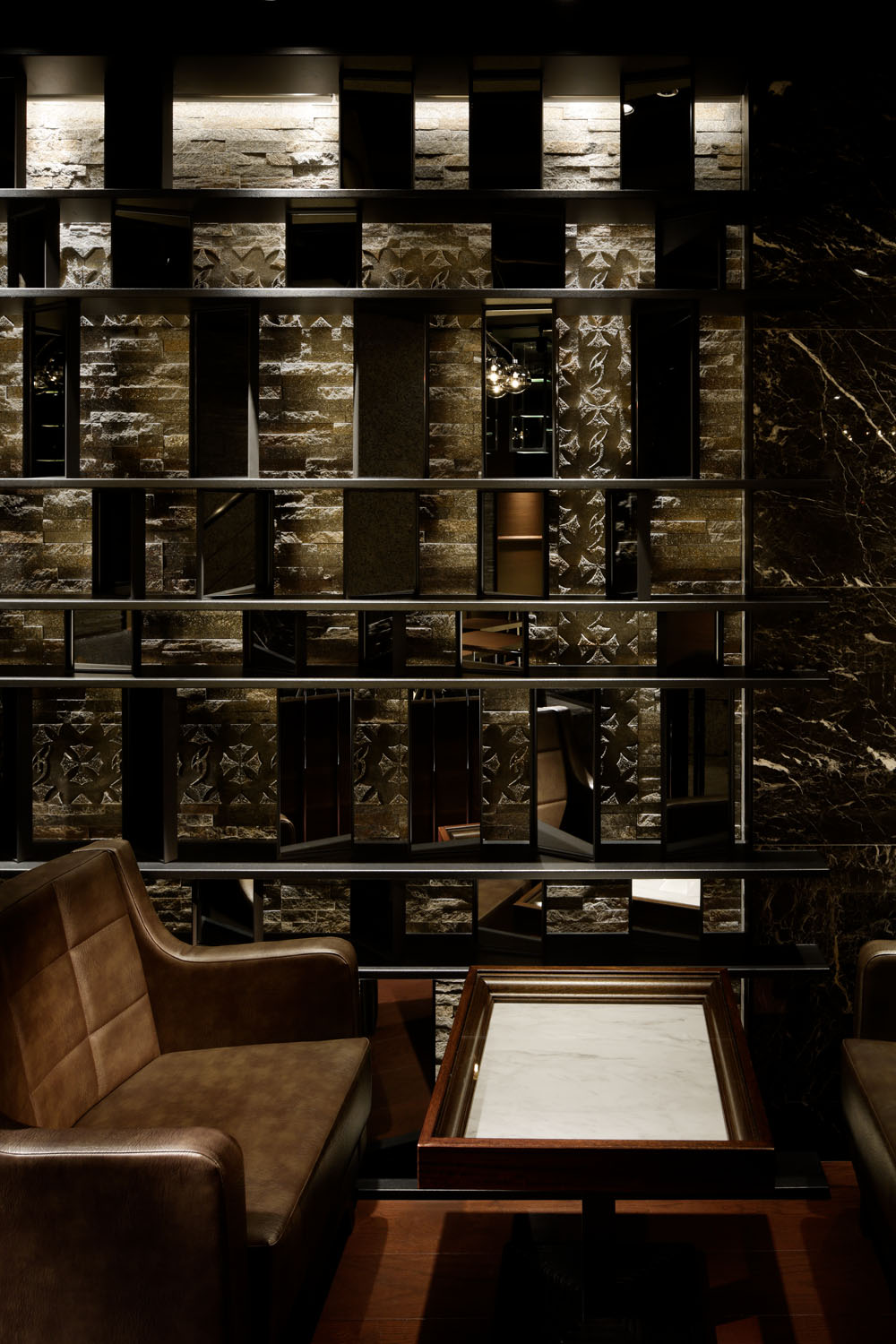 Steel and stones are used for materials to express highly sophisticated method such as utilizing horizontals and verticals consciously and providing fine carvings. We ensured high quality wood, leather and fabric, frequently utilized them where customers could actually reach. Canted wall covered with mirrors and randomly placed mirror shelf boards all have the effective techniques to maximize the small space.