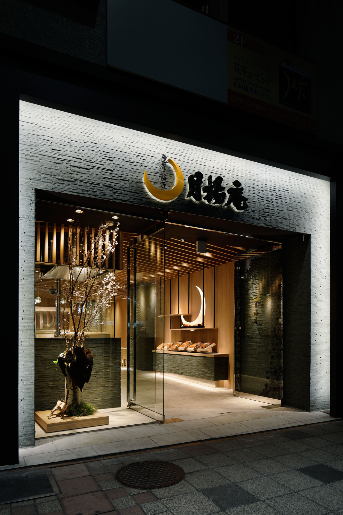 The design of this shop is Japanese modern style. As for the façade, gate shaped frame surround the outer periphery. By adding some lights, it can make differentiation from the other neighboring shops and makes it easier to generate original perspective of the world.
