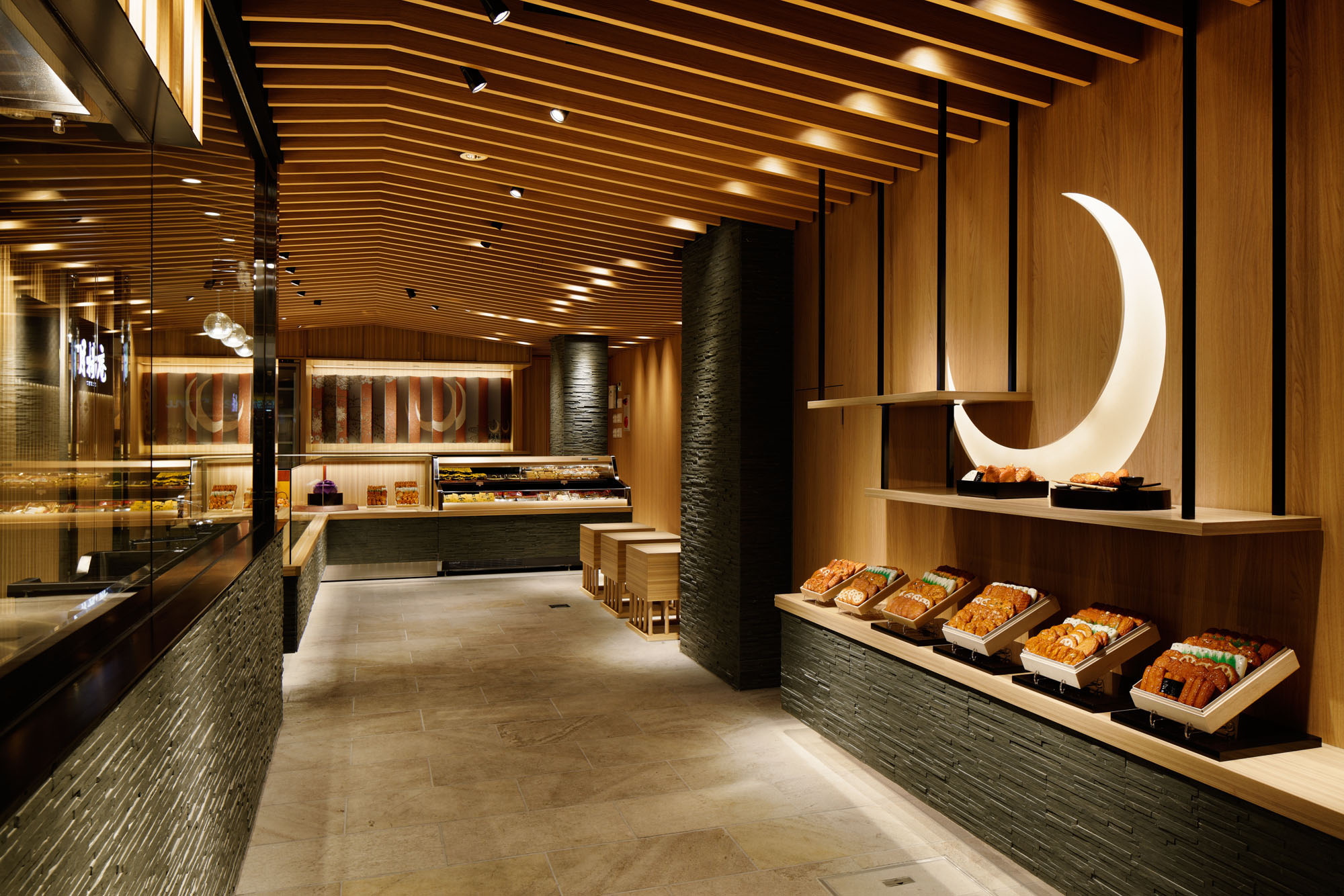 One of the characteristics of the shop’s interior design is the louver in the ceiling. Up from the middle top, slanted ceiling add up the impression of “Wa” (Japanese style). The continuity of the louver has the helpful effect of leading the customers farther into the shop.