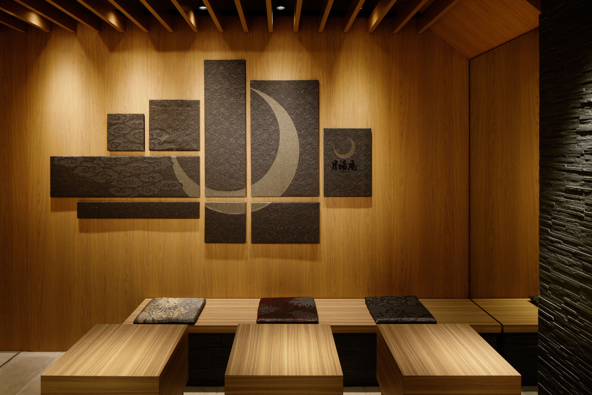 壁面のアートもアレンジの一つとして、お店のロゴマークからヒントを得た柄の生地をオリジナルで製作し、デザインしたパネルや屏風に組み合わせて飾っています。生地は着物の帯で使われる手法で織ってあるため、清楚な印象の中にも華やかなさを併せ持った表現ができたかと思います。