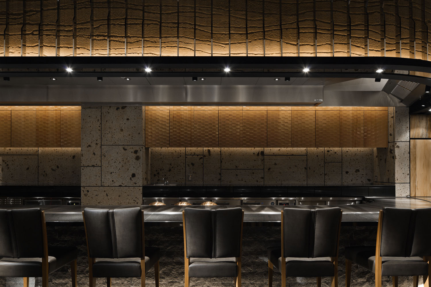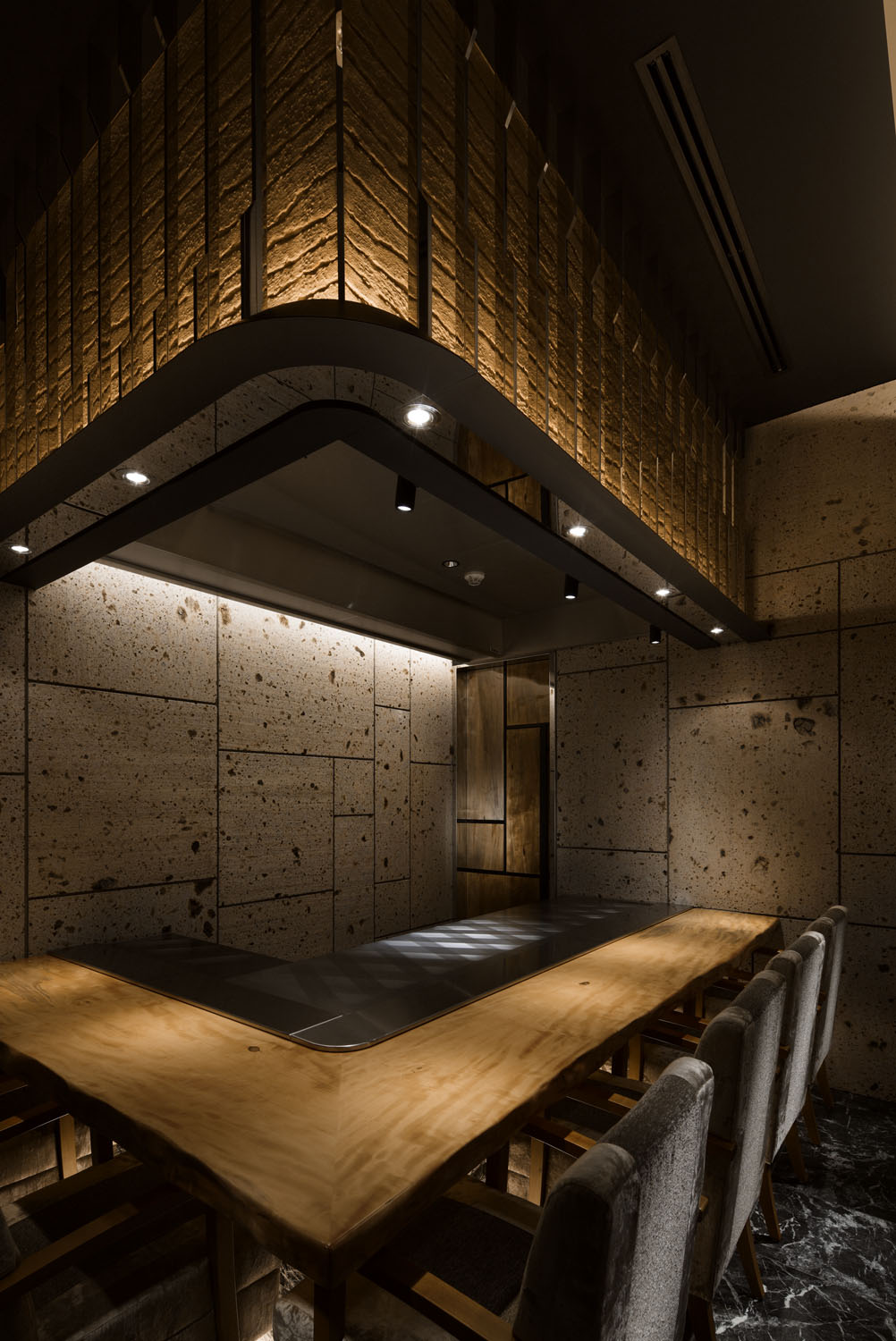 Apart from this, we avoided using ordinary stones and woods. We selected Oya-stones (very famous stones that represent Japan). To make contrast with the shiny wooden panels, we pasted various sized glides of Oya-Stones. As for the wooden door of hanging cupboards, the surfaces are curved in the technique called Naguri, also famous for Japanese traditional curving. And for the private dining room, transmissive stones occupy the whole wall and grids made with mirrored square pipes are used for the interior. You will feel something very special here through these infinite beauties of the stones.