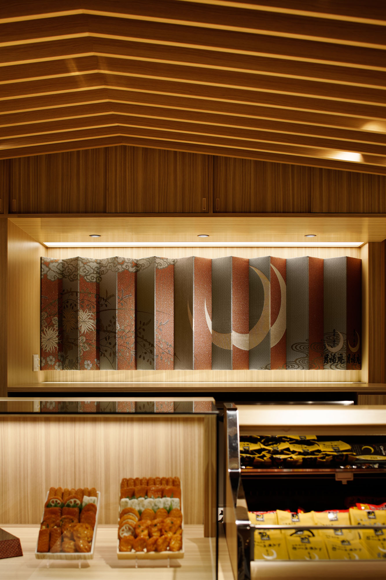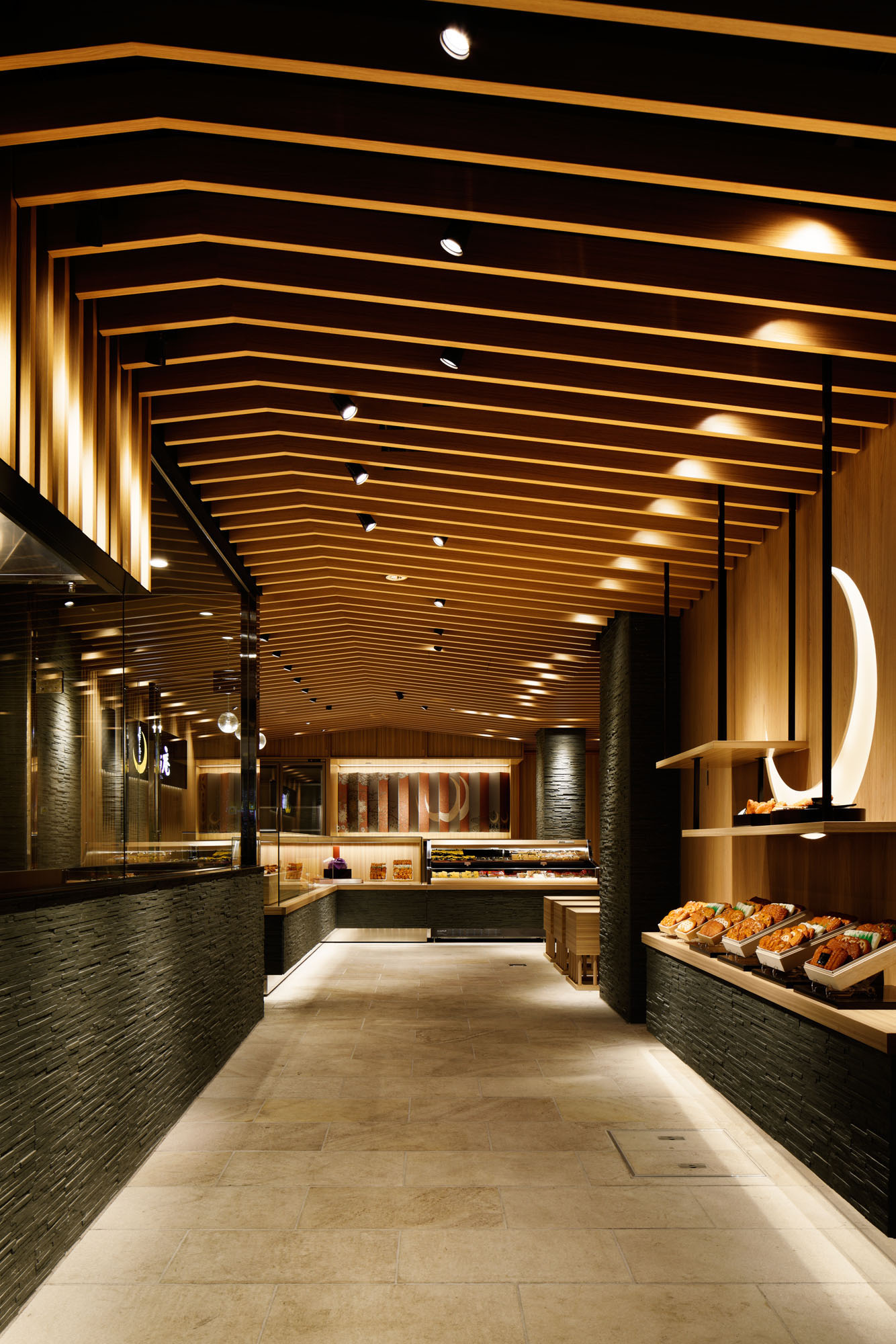 One of the characteristics of the shop’s interior design is the louver in the ceiling. Up from the middle top, slanted ceiling add up the impression of “Wa” (Japanese style). The continuity of the louver has the helpful effect of leading the customers farther into the shop.